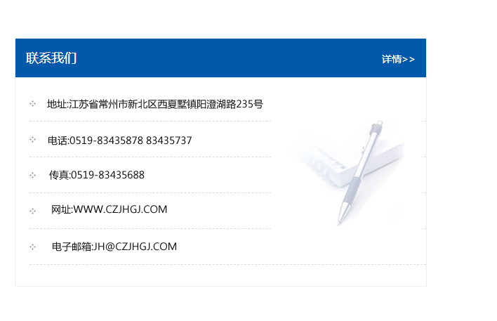 傳真:0519-83435688    郵編:213135    網(wǎng)址:WWW.czjhgj_com.fjzrfs.com    電子郵箱:JH@czjhgj_com.fjzrfs.com